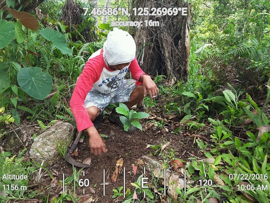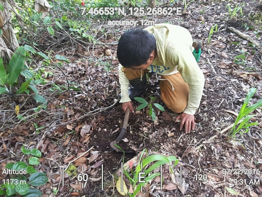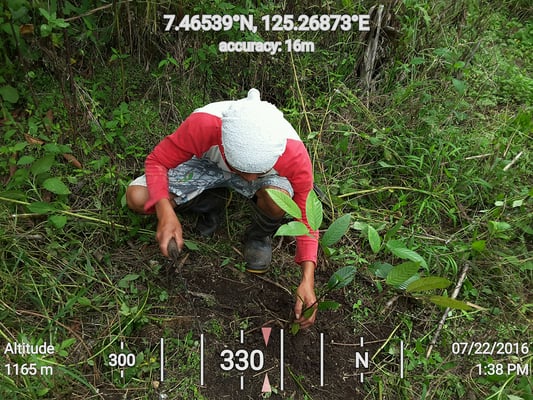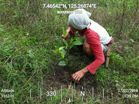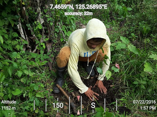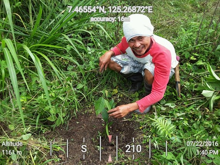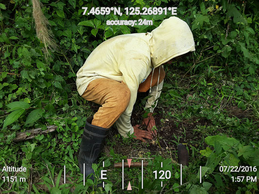 Ein Filipino setzt einen kleinen Narrabaum, der während des Pflanzens fotografiert wird. Außer Datum, Uhrzeit und Höhe weist das Foto die digitalen Koordinaten des Pflanzorts aus. Dies ist der Baum, der meiner Spende zugeordnet wird. Da die Pflanzer nicht jedesmal losmarschieren, wenn wieder Geld eingetroffen ist, pflanzt Mama Earth immer einige tausend Bäume im Voraus. „Meine“ Bäume wurden bereits im Juli gepflanzt