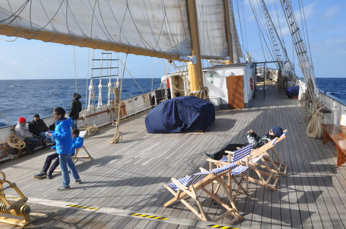 Auf der Fahrt nach Madeira bekommen wir den Seegang eines ausgewachsenen Sturmtiefs nördlich von uns zu spüren, was bei schwächerem Wind kein Vergnügen ist, vor allem wenn die See genau von der Seite kommt. Manche der Trainees sind etwas blass, berappeln sich aber im Lauf der Reise. Sie nehmen an Knotenkursen teil, wo die Crew einem – je nach Vorbildung – so nützliche Dinge wie den Palstek oder den Diamantknoten beibringt, welcher bei Dyneema-Softschäkeln Verwendung findet. Harry aus Berlin, der vor Jahrzehnten mal einen Sextanten in der Hand gehalten und sich mit Astro-Navigation befasst hat, leiht sich im Kartenhaus einen der beiden Sextanten und schießt stundenlang die Sonne, bis er’s wirklich kann. Manche liegen im Liegestuhl an Deck, andere klettern – beaufsichtigt von Bootsmann Ivo und Deck Cadet Pedro – auf den Klüverbaum. Delphine spielen ums Schiff, giftige Quallen vom Typ Portugiesische Galeere segeln scheinbar harmlos an der Wasseroberfläche. Die „Santa Maria Manuela“ eilt unter weißen Segeln ihrem Ziel entgegen, das sie pünktlich erreicht.
