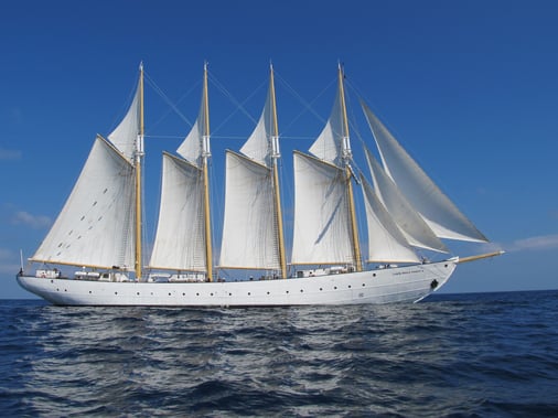 Die Gäste und Trainees an Bord nehmen die Maschine kaum wahr, interessanter sind die Segel. Ein Schoner-Rigg ist die ökonomischste Takelage für einen Großsegler. Man kann damit höher am Wind segeln als mit Rahsegeln, und man kommt mit weniger Crew aus.