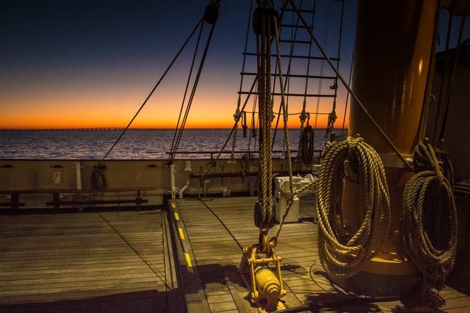 Wenn es aufbrist und die Crew die Segel „kürzt“, sind sie auch auf diesem Schoner mit vier oder fünf Mann an einem Segel zugange, und der Erste Offizier (first mate) leitet das Manöver. Oder der Bootsmann (bosun), wie es gerade kommt. Es ist auch für Segler ziemlich eindrucksvoll, die Leute mit den riesigen Segelfächen hantieren zu sehen, aber es wirkt auch sehr unaufgeregt. Auf einem großen Schiff zu segeln, ist mit sportlicher Segelei, auch auf großen Yachten, nicht zu vergleichen. Es ist einerseits harte Arbeit, aber das Wichtigste ist (und das gilt natürlich auch auf kleineren Schiffen), dass die Crew die Segel unter Kontrolle hat. So haben die gewaltigen Gaffeln außer Piek- und Klaufall eine eigene Schot, und jeder Baum wird beim Wenden gesichert auf die andere Seite geführt.