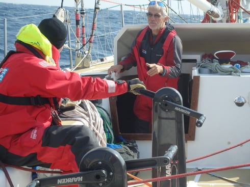 Es ist städnig was zu tun, und die Stammcrew, wie ich die Round The Worlders mal nennen möchte, weist uns geduldig und systematisch in unsere Aufgaben ein. Heute und auf den vergangenen Wachen habe ich unter Dougs und Gregs wachsamen Augen und hilfreichen Erklärungen ein paar Stunden den Spi gefahren. Das geht im Prinzip wie auf kleineren Booten auch, nur das Gefahrenpotential ist größer und Schäden sind teurer.