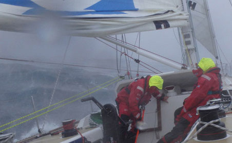 "Wie Sommer in Schottland..." - Clipper Racer im Orkan im Southern Ocean. Vicky Ellis (li.) war die erste Frau, die eine Clipper-Yacht um die Welt geskippert hat. Die Ingenieurin löst Probleme im Maschinenraum gern selbst