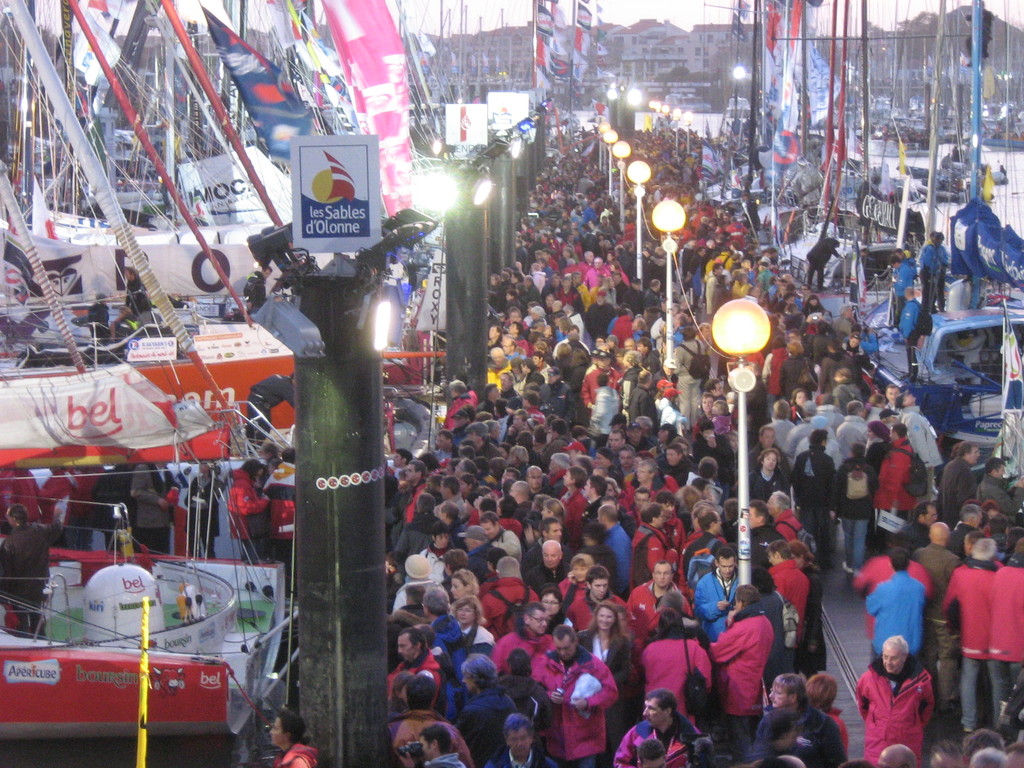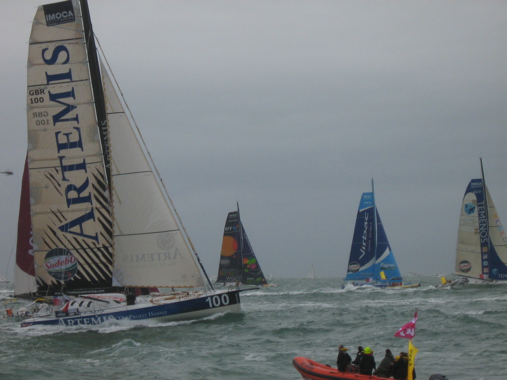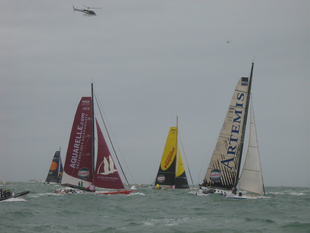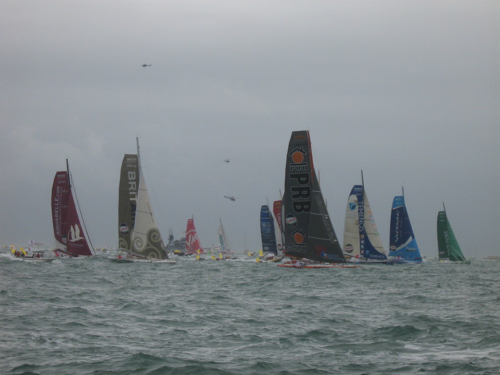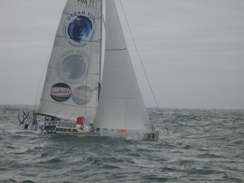 So sah's 2008 aus. Schlechtes Wetter, grandiose Stimmung und ein super Rennen, bei dem Sam Davies mit "Roxy" als Dritte ins Ziel kam und ihren Podiumsplatz an Marc Guillemot abtreten musste. Der hatte 50 Stunden Zeitgutschrift, weil er im Southern Ocean einem verletzten Skipper beigestanden hatte. Kurz vor dem Ziel fiel Guillemot der Kiel ab, aber er hinkte als Riesenjolle unter Wasserballast ins Ziel - eine gute Stunde vor Ablaufen der Zeitgutschrift.