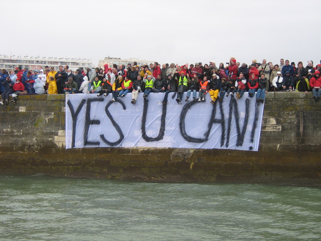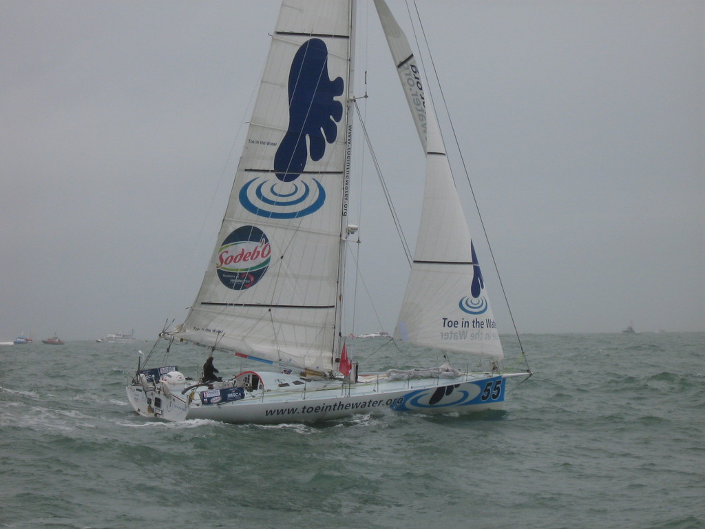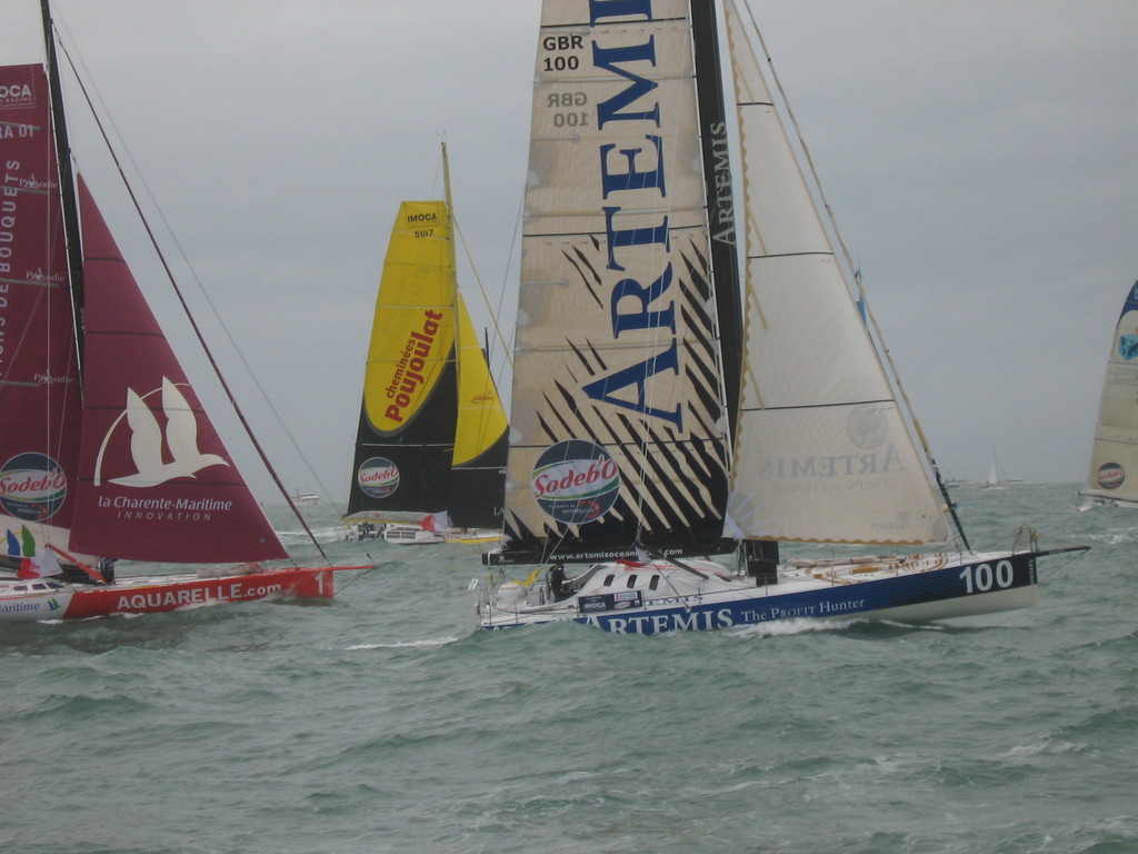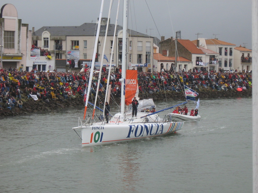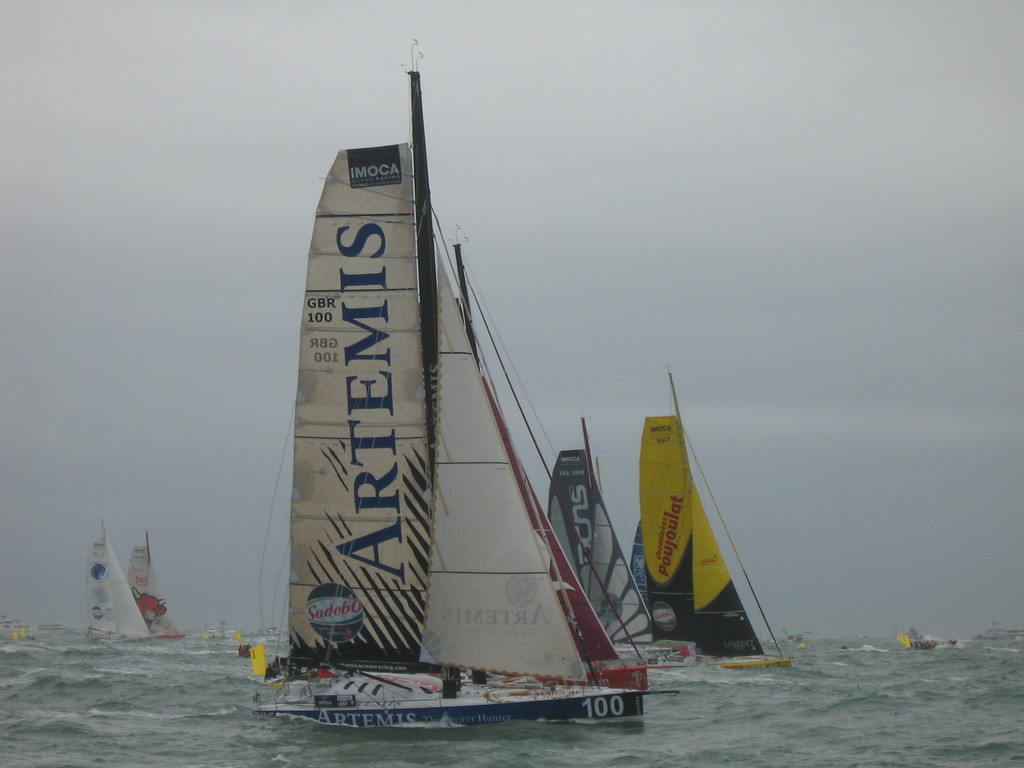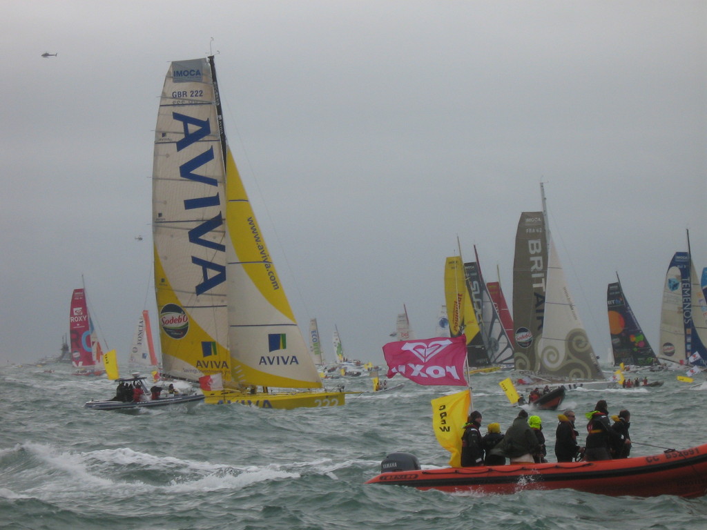 So sah's 2008 aus. Schlechtes Wetter, grandiose Stimmung und ein super Rennen, bei dem Sam Davies mit "Roxy" als Dritte ins Ziel kam und ihren Podiumsplatz an Marc Guillemot abtreten musste. Der hatte 50 Stunden Zeitgutschrift, weil er im Southern Ocean einem verletzten Skipper beigestanden hatte. Kurz vor dem Ziel fiel Guillemot der Kiel ab, aber er hinkte als Riesenjolle unter Wasserballast ins Ziel - eine gute Stunde vor Ablaufen der Zeitgutschrift.